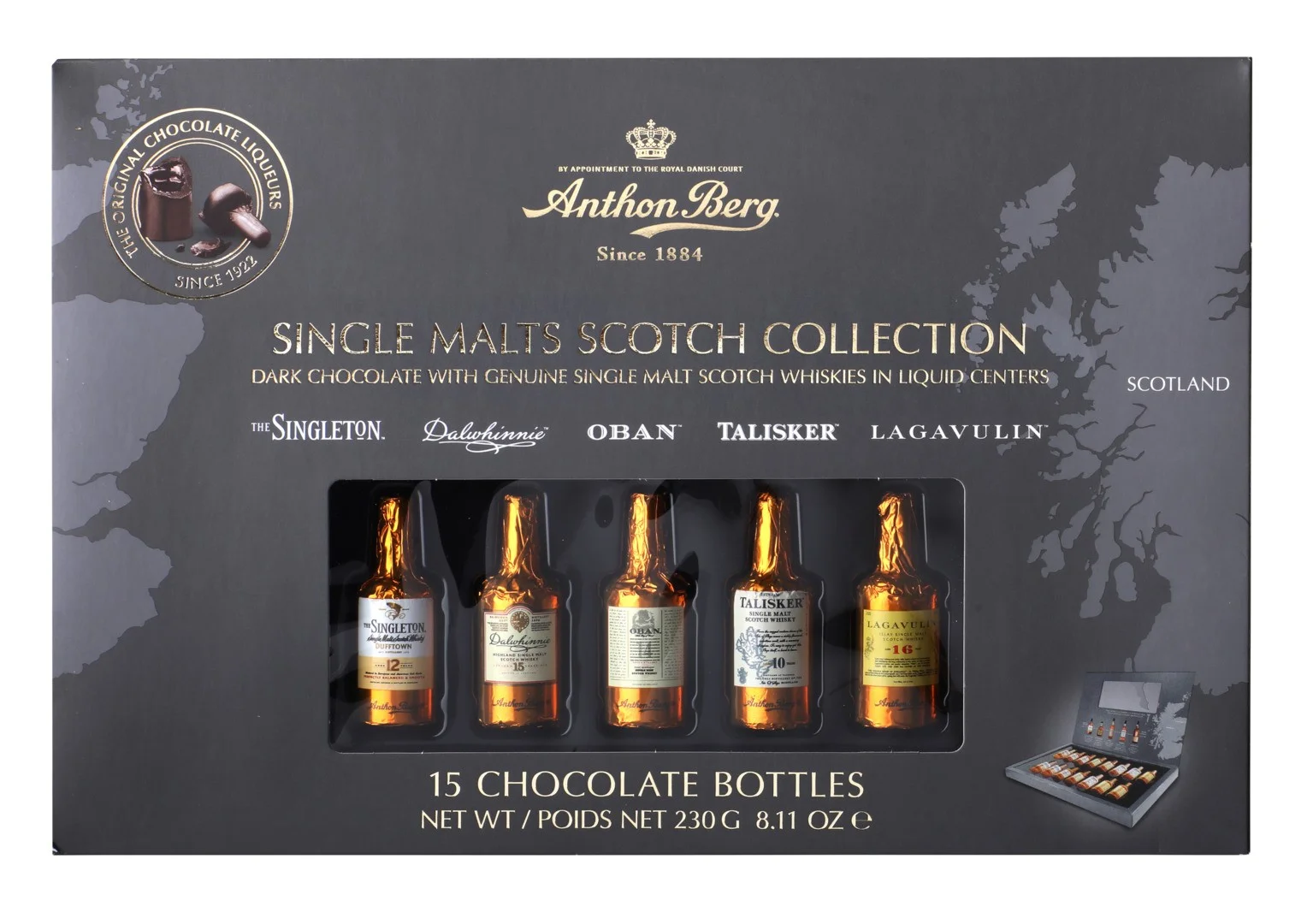 Šokolādes ar Oriģinālu alkoholisko dzērienu pildījumu 33%. Sastāvdaļas: cukurs, kakao masa, kakao sviests, ūdens, viskijs 7%, alkohols. Var saturēt piena un riekstu daļiņas. Kakao vismaz 50% šokolādes daļā. Alc. min 2,4% maks. 3,0% tilp. Enerģētiskā un uzturvērtība:100g: 1923Kj/460kcaL, tauki 23g(tostarp piesātinātās taukskābes 15g), ogļhidrāti 56g (tostarp cukuri 50g), olbaltumvielas 2,6g, sāls <0,01g. Neto masa: 230g. Uzglabāt sausā, vēsā vietā. Ieteicams līdz: skatīt uz iepakojuma. Ražotājs: Anthon Berg A/S, Dānija.