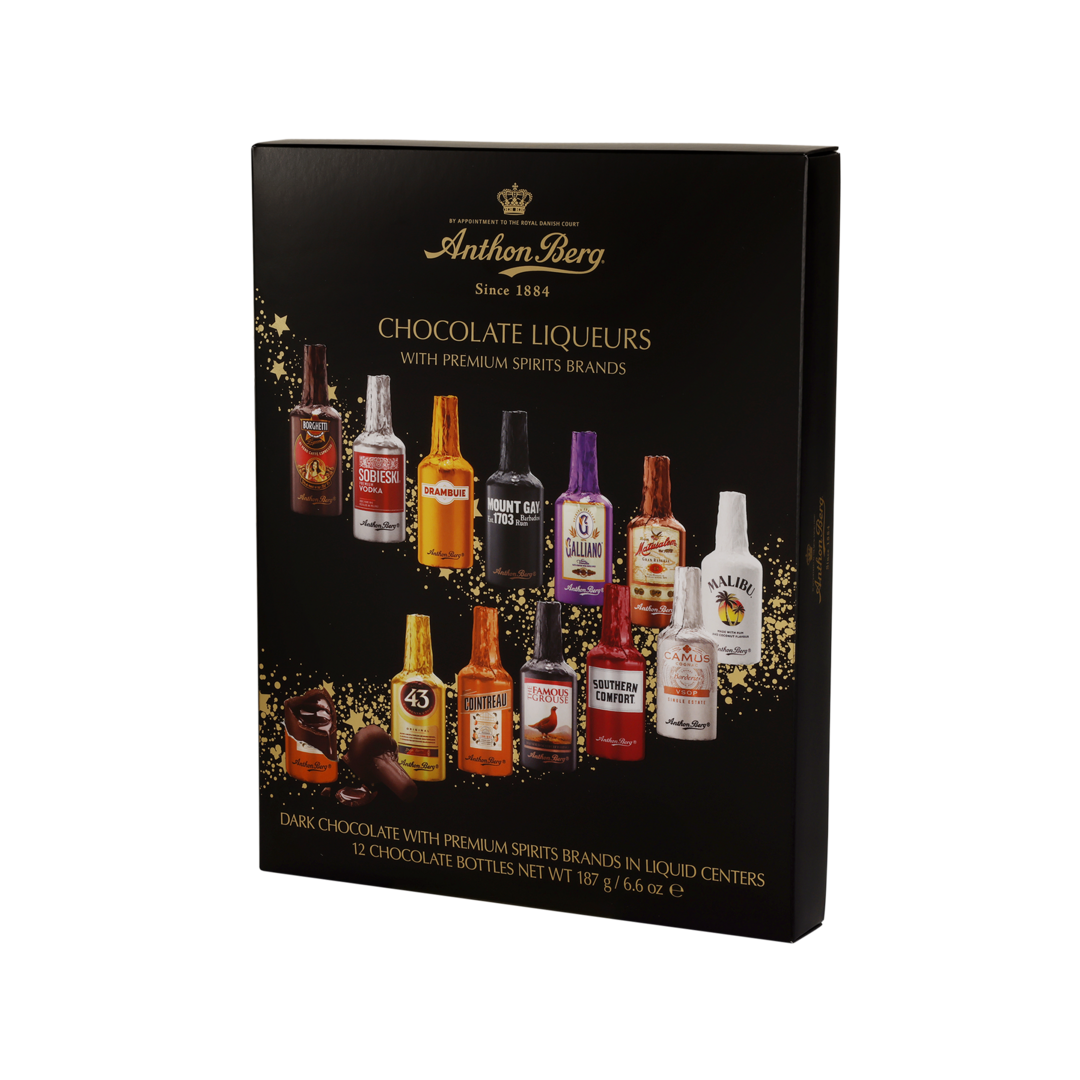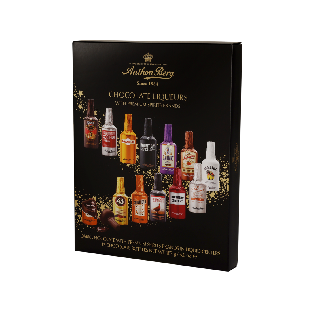 Tumšās šokolādes ar pildījumu 33% un alkoholu. Sastāvdaļas: cukurs, kakao masa*, kakao sviests*, ūdens, alkohols 5% (viskija liķieris, rums, liķieris, viskijs, konjaks, degvīns), dabīgais apelsīnu aromatizētājs (Cointreau@) 0,8%, liķiera koncentrāts 0,7%, vaniļas koncentrāts 0,5%, aromatizētāji. Var saturēt piena un riekstu daļiņas. Alc. min 1,4% max 3,9% tilp. Kakao vismaz 50% šokolādes daļā. *Lietus Mežu Alianses sertifikāts. Enerģētiskā un uzturvērtība:100g: 1936 kJ/ 464 kcal, tauki 24g (tostarp piesātinātās taukskābes 15g), ogļhidrāti 51g (tostarp cukuri 48g), olbaltumvielas 2,8g, sāls <0,01g. Neto masa: 187g. Uzglabāt sausā, vēsā vietā. Ieteicams līdz: skatīt uz iepakojuma. Ražotājs: Anthon Berg A/S, Dānija
