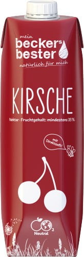 Ķiršu nektārs. Augļu saturs: vismaz 35% augļu sulā. Sastāvdaļas: ūdens, skābo ķiršu biezenis, cukurs, skābo ķiršu sula, citronu sulas koncentrāts. Enerģētiskā un uzturvērtība: 100ml satur: 231kJ /55 kcal, Tauki 0,1g (tostarp piesātin.tauksk. <0,1g), Ogļhidrāti 12,9g (tostarp cukuri 12,2g), Olbaltumv.0,1g, šķiedrvielas 0,1g, Sāls 0,01g. Pēc atvēršanas vislabāk ievietot ledusskapī vertikāli, tad šis dabīgais produkts saglabāsies 2-3 dienas . Neto masa: 1L. Ieteicams līdz: skat. Uz iepak.