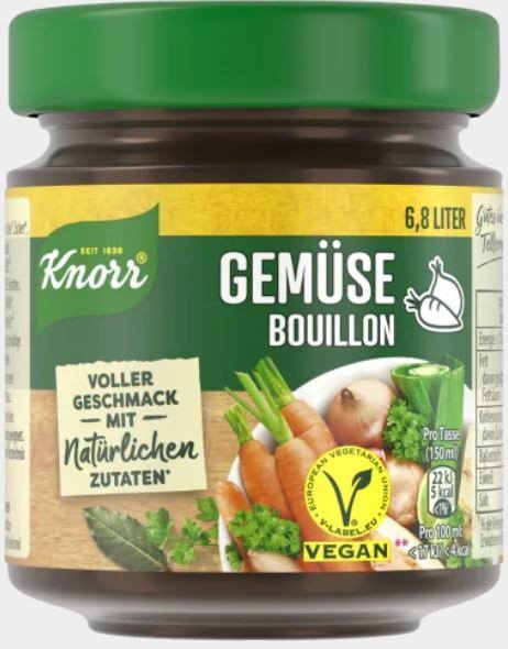 Dārzeņu buljona koncentrāts (7L škidrumam=46 tasēm). Sastāvdaļas: jodēts sāls, cukurs¹, kālija hlorīds*, ciete¹, 6,7% burkāni¹², aromatizētāji, 5,8% sīpoli¹², 3,1% SELERIJAS¹², sāls, 1,1% pētersiļi ¹², kukurūzas eļļa¹, pētersiļu garšviela, ķiploki¹², SELERIJU sēklas¹, kurkuma¹², lupstāja garšviela¹², 0,2% lauru lapas¹², pipari*, skābuma regulētājs (citronskābe*). Var saturēt glutēnu sat. graudu, pienu, olu, sojas, sinepju daļiņas. ¹ dabīgās sastāvdaļas. ² ilgtspējīga audzēšana. * no dabīgiem kālija minerāliem.Enerģētiskā un uzturvērt.: 100g: 17kJ/ 4kcal, tauki <0,5g(tostarp piesātin.tauksk.<0,1g), ogļhidrāti 0,7g (tostarp cukuri <0,5g), šķiedrvielas <0,5g, olbaltumv.<0,5g, sāls 0,59g. Gatavošana: 1/2 tējk.(2,7g) aplej vai iemaisa 150ml verdošā ūdenī, buljonā vai pienā. Neto masa: 136g. Uzglabāt sausā, vēsā vietā. Ieteicams līdz: skat.uz iepak. Polija.