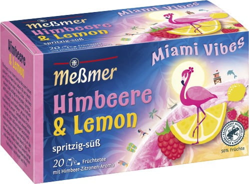 ”Maiami noskaņa„ augļu tēja ar aveņu-citronu garšu. Sastāvdaļas: rožu pumpuri*, hibisks*, aromatizētājs, saldās kazenes lapas, stēvija, citron miziņa, avenes. Enerģētiskā un uzturvērtība: 100ml satur 10kJ/2kcal. Tauki <0,5g(tostarp piesātinātās taukskābes <0,1g), ogļhidrāti <0,6g (tostarp cukuri <0,5g), olbaltumvielas <0,5g, sāls <0.01g. 50% augļi -Lietus Mežu Alianses sertifikāts. Pagatavošana: verdošā ūdenī vai citi šķidrumā, piemēram, buljonā vai pienā. Attiecībā uz tasi vienmēr 1 tējas maisiņš. Vismaz 4 tējas maisiņi kannai (1L). Vienmēr pārlejiet ar verdošu šķidrumu un ļaujiet ievilkties 8 minūtes! Neto masa: 20 x 2,5g=50g. Uzglabāt sausā, vēsā vietā. Ieteicams līdz skatīt uz iepak. Vācija.