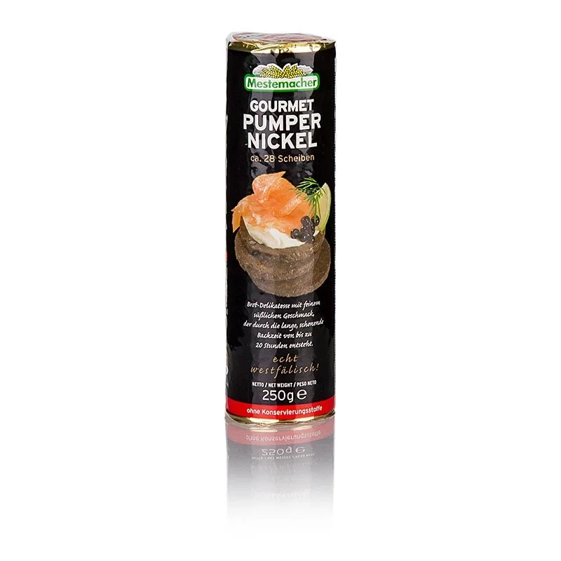 Pumperniķeļi. Rudzu maizes delikatese. (28 šķēlītes). Nesatur konservantus. Sastāvs: rudzu graudi , ūdens, cukurbiešu sīrups, sāls, iesala ekstraksts(mieži), raugs. Var saturēt riekstu, piena, sojas un sezama daļiņas. Enerģētiskā un uzturvērtība: 100 produkta satur: 881Kj/209kcaL, tauki 2,4g(tostarp piesātinātās taukskābes 0,3g), ogļhidrāti 36,4g (tostarp cukurs 6,4g),šķiedrvielas 10,2g, olbaltumvielas 5,4g, sāls 1,2g. Neto masa: 250 g. Pēc atvēršanas uzglabāt sausā, vēsā vietā.Ieteicams līdz: skat. uz iepakojuma. Pēc atvēršanas izlietot dažu dienu laikā. Ražots Vācijā.