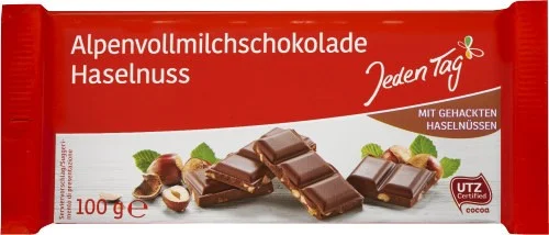 Alpu Pilnpiena šokolāde (vismaz 30% kakao) ar smalcinātiem Lazdu riekstiem 12%. Sastāvdaļas: cukurs, kakao sviests, kakao masa, smalcināti lazdu rieksti, pilnpiena pulv., krējuma pulv. (piens), sūkalu pulv.(piens), sviesta tauki (piens), emulgators (sojas lecitīns), vaniļa ekstrakts. Var saturēt citu riekstu un glutēna daļiņas. Enerģētiskā un uzturvērtība: 100g satur: 2303kJ/553kcal. Tauki 35g(tostarp piesātinātās taukskābes18g), ogļhidrāti 50g(tostarp cukuri 48g), olbaltumvielas 7,0g, sāls 0,20g. Neto masa: 100g. Uzglabāt sausā, vēsā vietā. Sargāt no karstuma.