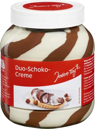 DUO Piena-Šokolādes Krēms. Sastāvdaļas: Cukurs, rapšu eļļa, palmu eļļa, 5,5% VĀJPIENA pulveris, saldo sūkalu pulveris (izgatavots no PIENA), 2,5% kakao pulveris ar zemu tauku saturu, 1% LAZDU RIEKSTI, emulgators: saulespuķu lecitīns. Enerģētiskā un uzturvērtība: 100g prod. satur: 2363kJ / 568 kcal, Tauki 36g (tostarp piesātinātās taukskābes 8,4g), Ogļhidrāti 57g (tostarp cukuri 57g), Olbaltumvielas 3,2g, Sāls 0,13g. Uzglabāt istabas temperatūrā. Pēc atvēršanas izlietot iespējami īsākā laikā. Neto masa: 750g. Ieteicams līdz : skat. uz iepakojuma. Vācija.