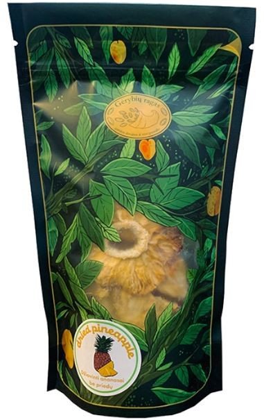 Žāvēti ananasi bez pievienotā cukura. Sastāvdaļas: 100% ananasi. Var saturēt riekstu un sezama daļiņas. Produkts var izraisīt alerģisku reakciju.Enerģētiskā un uzturvērtība: 100g produkta satur: 1506 kJ / 360 kcal, tauki 0 g, tostarp piesātinātās taukskābes 0 g, ogļhidrāti 89 g, tostarp cukuri 23 g, olbaltumvielas 2 g, sāls 0,11 g Uzglabāt sausā, vēsā vietā. Neto masa: 150g. Ieteicams līdz: skatīt uz iepakojuma. Izcelsmes valsts: Gana.