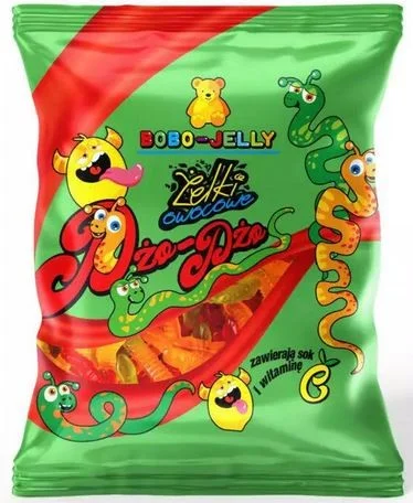 DODO WORMS. Želejkonfektes ar augļu garšu, ar augļu sulu un C vitamīnu. Sastāvdaļas: glikozes sīrups, cukurs, ūdens, želējošā viela (želatīns (cūka)), skāb.reg.: (citronskābe), sulas konc.no pulv.2% (apelsīnu, ābolu, zemeņu, citronu), stabilizētājs (sorbīts), C vitamīns (L-askorbīnskābe), melno burkānu sulas koncentrāts, krāsvielas (karotīns, briljanta zilais FCF), aromatizētājs, glazētājviela (bišu vasks balts, karnauba vasks), satur safloras un/vai kurkumas ekstr. Var saturēt zemesriekstu daļiņas. 100g: Enerģētiskā un uzturvērt.1371kJ/324kcal, tauki 0,22g(tost. Piesātin.tauksk.0,1), ogļhidrāti 73g (tost.cukuri 45g), olbaltumv.6,8 g, sāls 0,02g, C vitamīns 80mg (100%*)* -Ieteicamā dienas deva. Uzglabāt vēsā vietā. Ieteic.līdz: skat uz iepak. Neto masa: 80 g. Polija.
